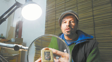 Con una lupa de tamaño considerable, pinceles delgadísimos y acuarelas de todos los colores, Enrique Miranda, de 44 años, se predispone a trabajar en su taller ubicado en la colonial calle Jaén de la zona Norte de La Paz.